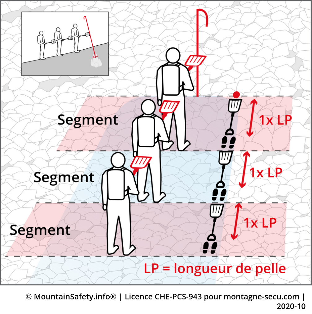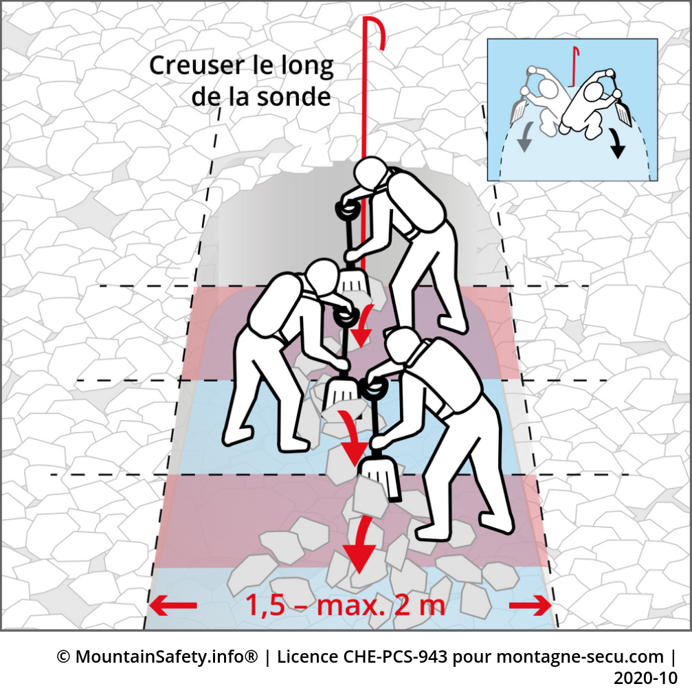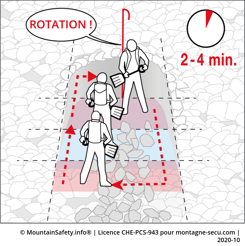 Dès que le sauveteur cherchant au DVA (Détecteur de Victimes d’Avalanche) arrive dans la zone des 3 m, les sauveteurs qui le suivent peuvent déjà commencer à organiser le chantier. Ils commencent à creuser en arrière du sauveteur de pointe.