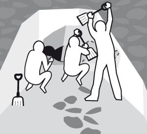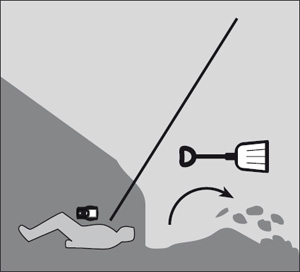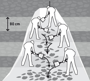 • Travail précautionneux près de la victime tandis que certains pelleteurs découpent de manière énergique les côtés de la cavité pour adapter la pointe du "V" à la position réelle de la victime.