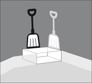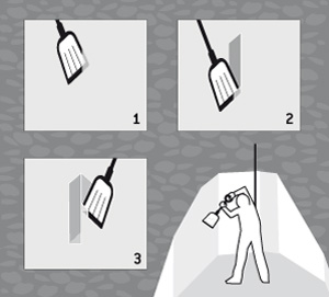 • Elargissement des côtés: en concentrant toute la force sur l'angle de la pelle, même un mur de neige très dur peut être "attaqué". Découper des colonnes triangulaires afin de dégager facilement la neige.