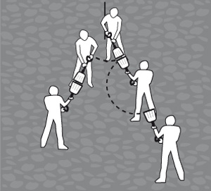 • Découpage de blocs : le secouriste tourné vers l'extérieur du V découpe, pelle à 90° pour un découpage optimal. Les sections doivent être étroites afin qu'elles puissent être brisées facilement.