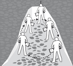 • La rotation, dans le sens des aiguilles d'une montre, est initiée par la personne à l'avant : le travail en rotation maintien un haut niveau de motivation et minimise la fatigue prématurée.