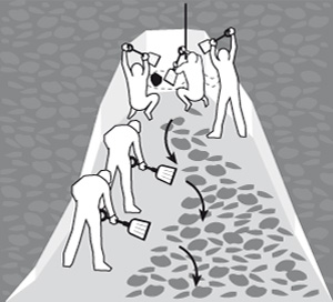 Ils prennent entre eux la distance d’une longueur de pelle. Puis ils se décalent en quinconce sur les bords du U.