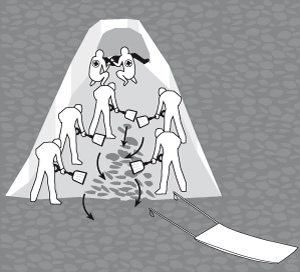 Passez la neige soit par le côté, soit entre les jambes. Ne lancez pas la neige sur les côtés du U ou par-dessus l’épaule : elle retombe en général dans la tranchée.