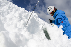 Lorsque la victime a été touchée avec la sonde, le sauveteur laisse la sonde en place et se décale vers le bas. Il sera plus facile de dégager la neige vers le bas de la pente.